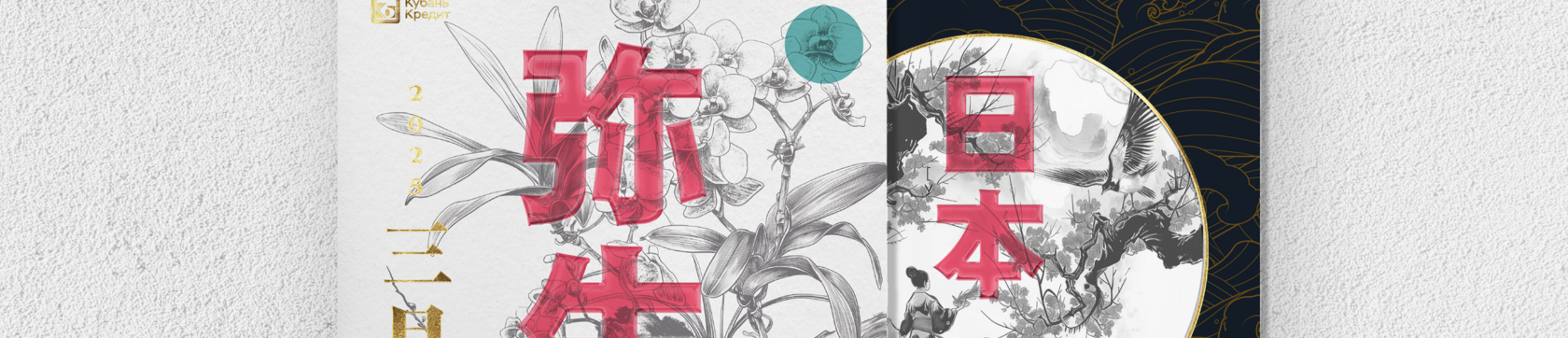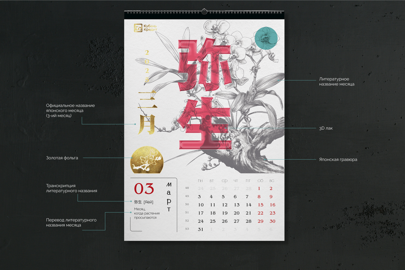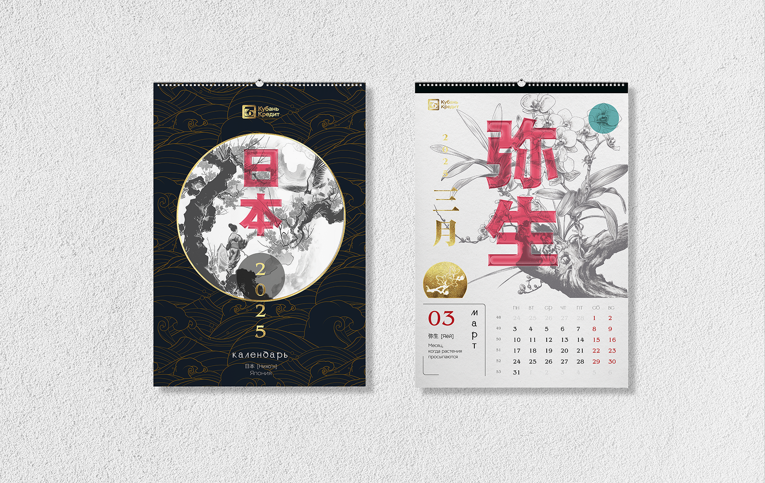 Создать концепцию календаря в стилистике Японской гравюры, с использованием разных техник нанесений.