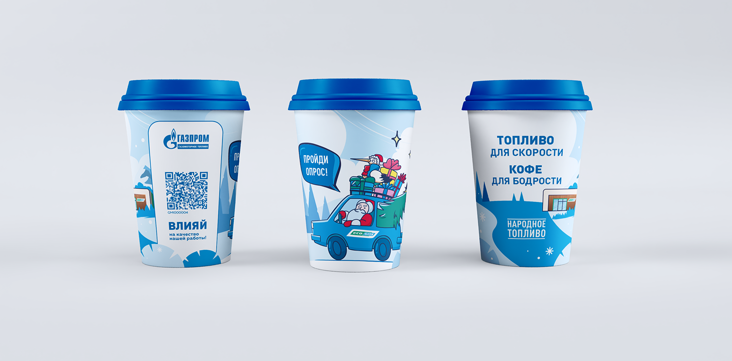 Представлен новый визуальный концепт для EcoGas, который включает обновленный дизайн магазина. Свежий стиль необходимо было адаптировать и визуализировать на стаканчиках, чтобы привлечь внимание.