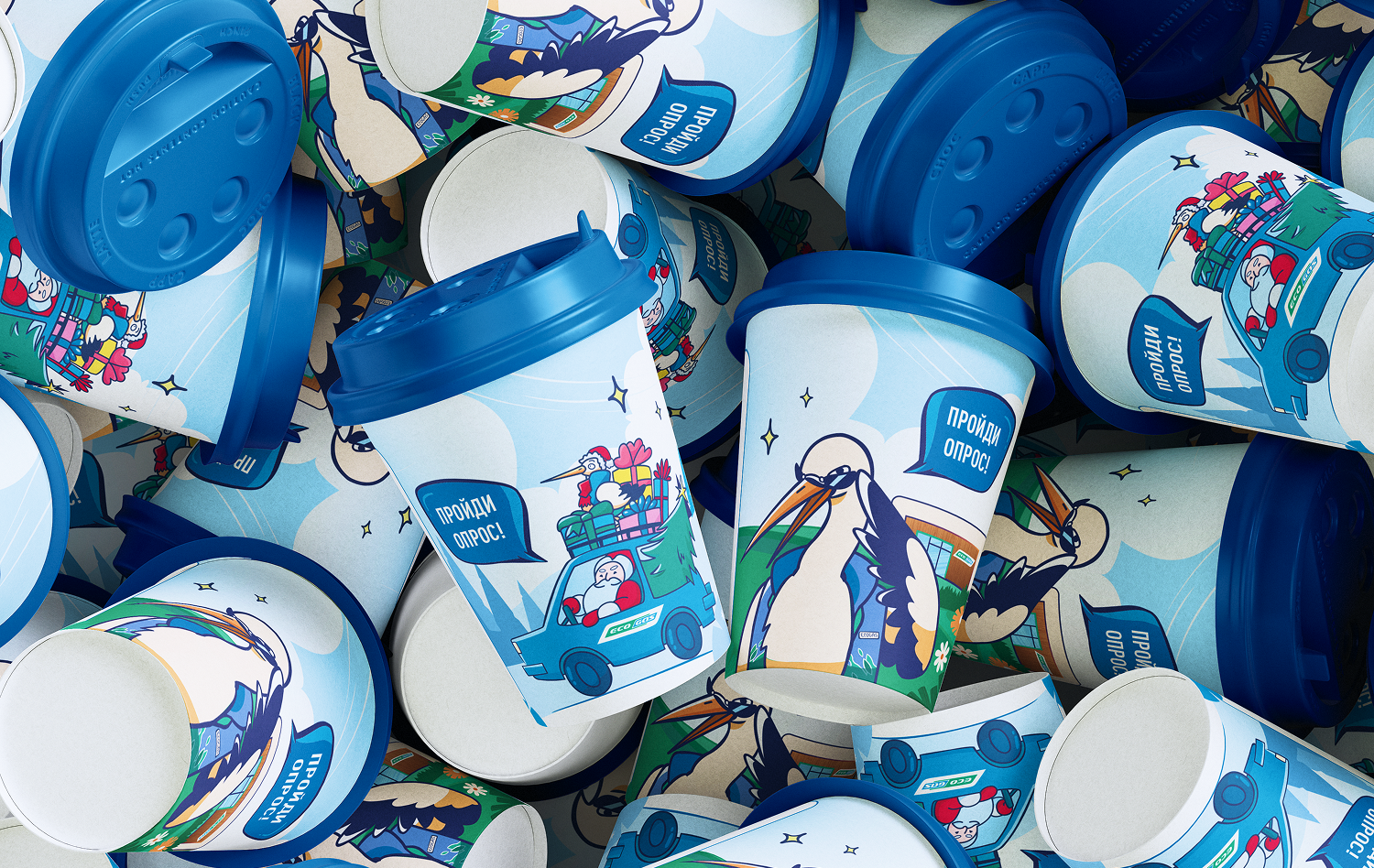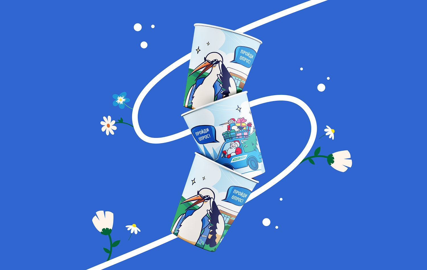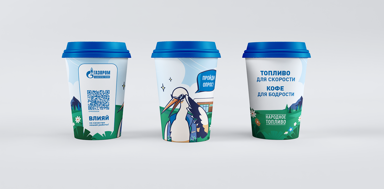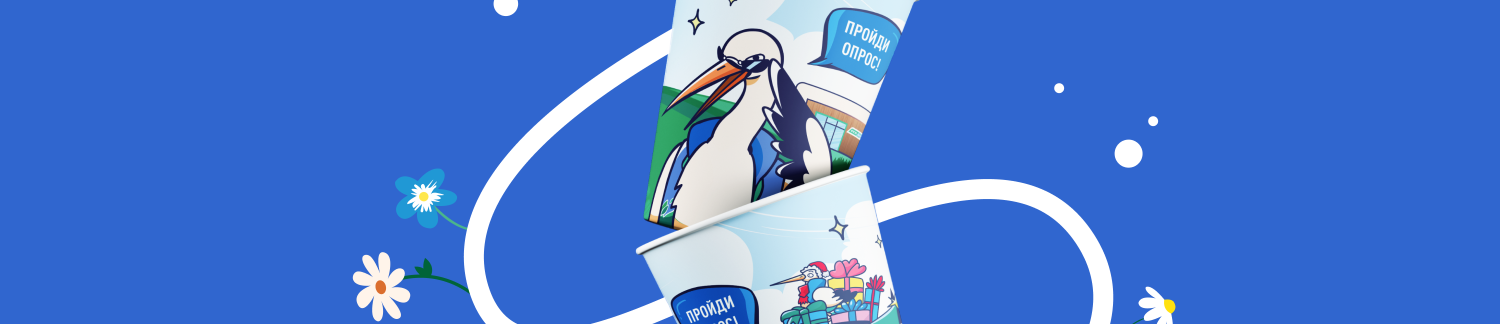Создать дизайн стаканчиков для магазинов около заправок. Маскот бренда в этом году — аист. Необходимо было сделать два дизайна стаканчиков: для летнего времени и для зимнего. Добавить QR код для опроса и придумать соответствующий слоган для стаканчиков.