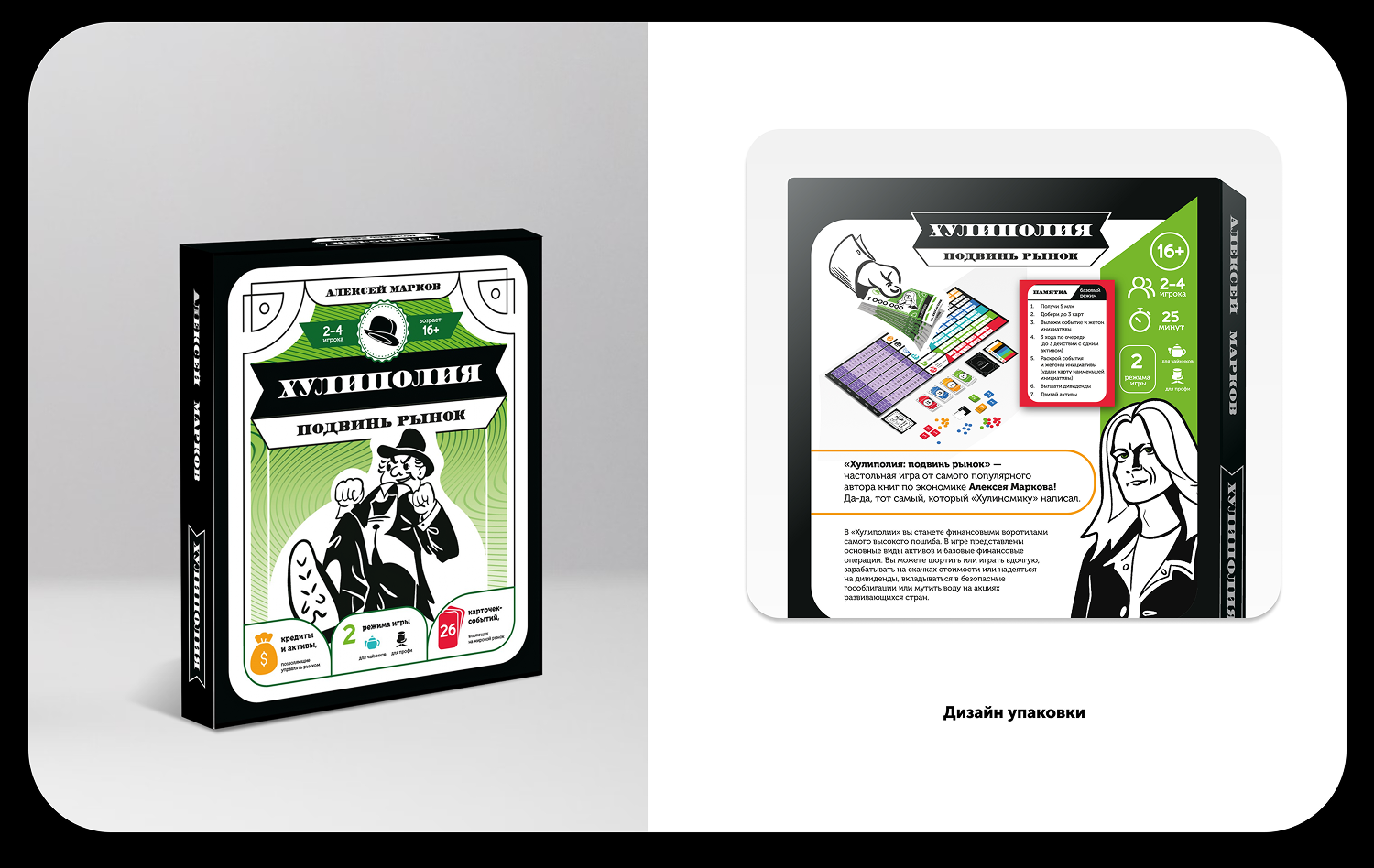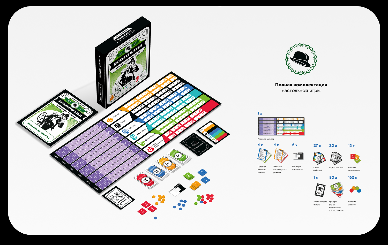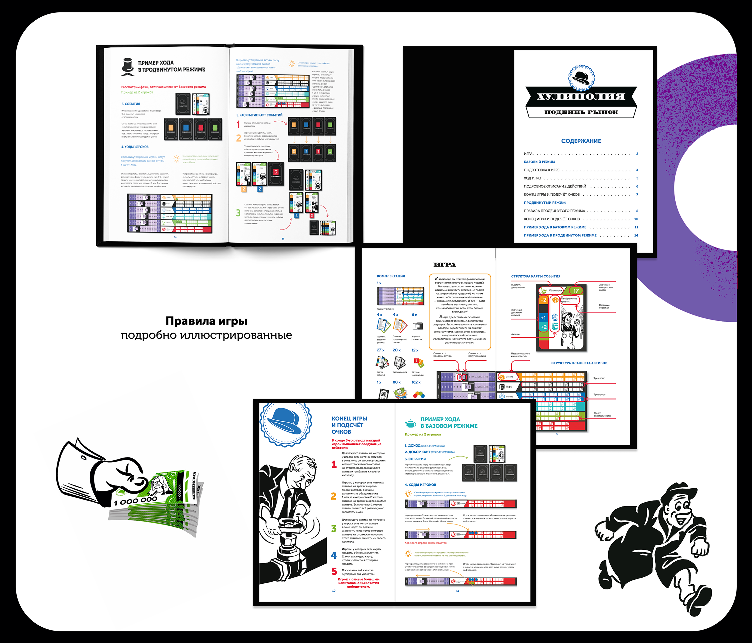 Разработать дизайн для настольной игры. Создать игровые карточки, поле, купюры с различными номиналами, жетоны и иллюстрации в стиле Херлуфа Бидструпа для каждой карточки и коробки. Отрисовать иконки, разработать упаковку и сверстать брошюру с правилами игры. Дополнить дизайн портретом автора игры, размещенным на игровой валюте, и подготовить макеты к печати, включая выкройки для упаковки.