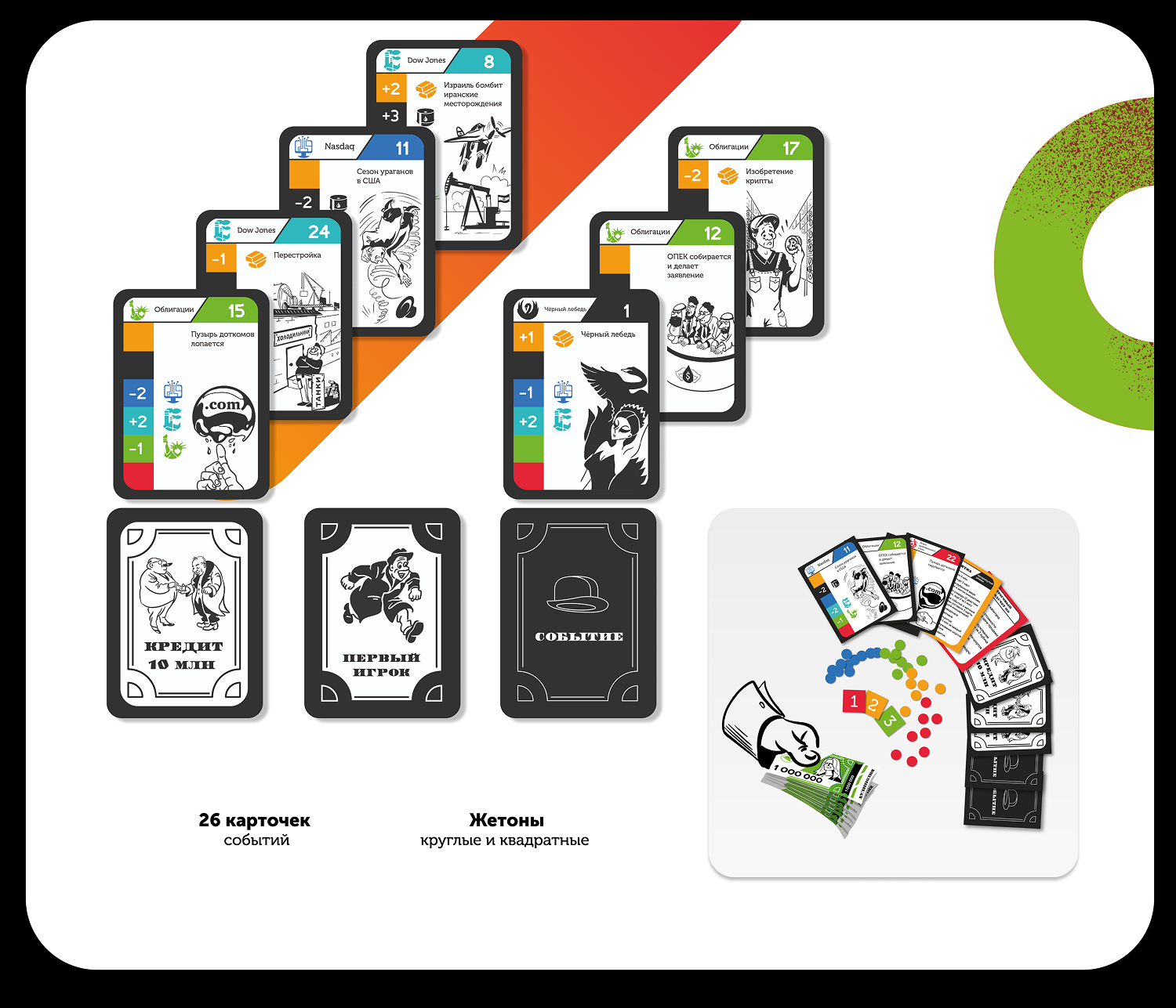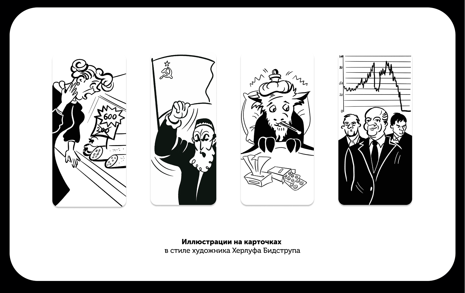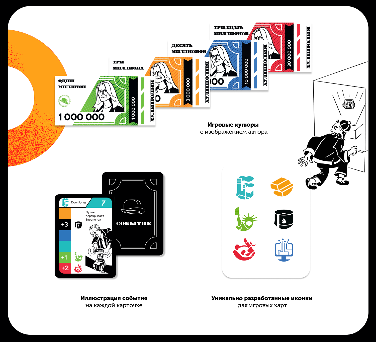 Разработать дизайн для настольной игры. Создать игровые карточки, поле, купюры с различными номиналами, жетоны и иллюстрации в стиле Херлуфа Бидструпа для каждой карточки и коробки. Отрисовать иконки, разработать упаковку и сверстать брошюру с правилами игры. Дополнить дизайн портретом автора игры, размещенным на игровой валюте, и подготовить макеты к печати, включая выкройки для упаковки.